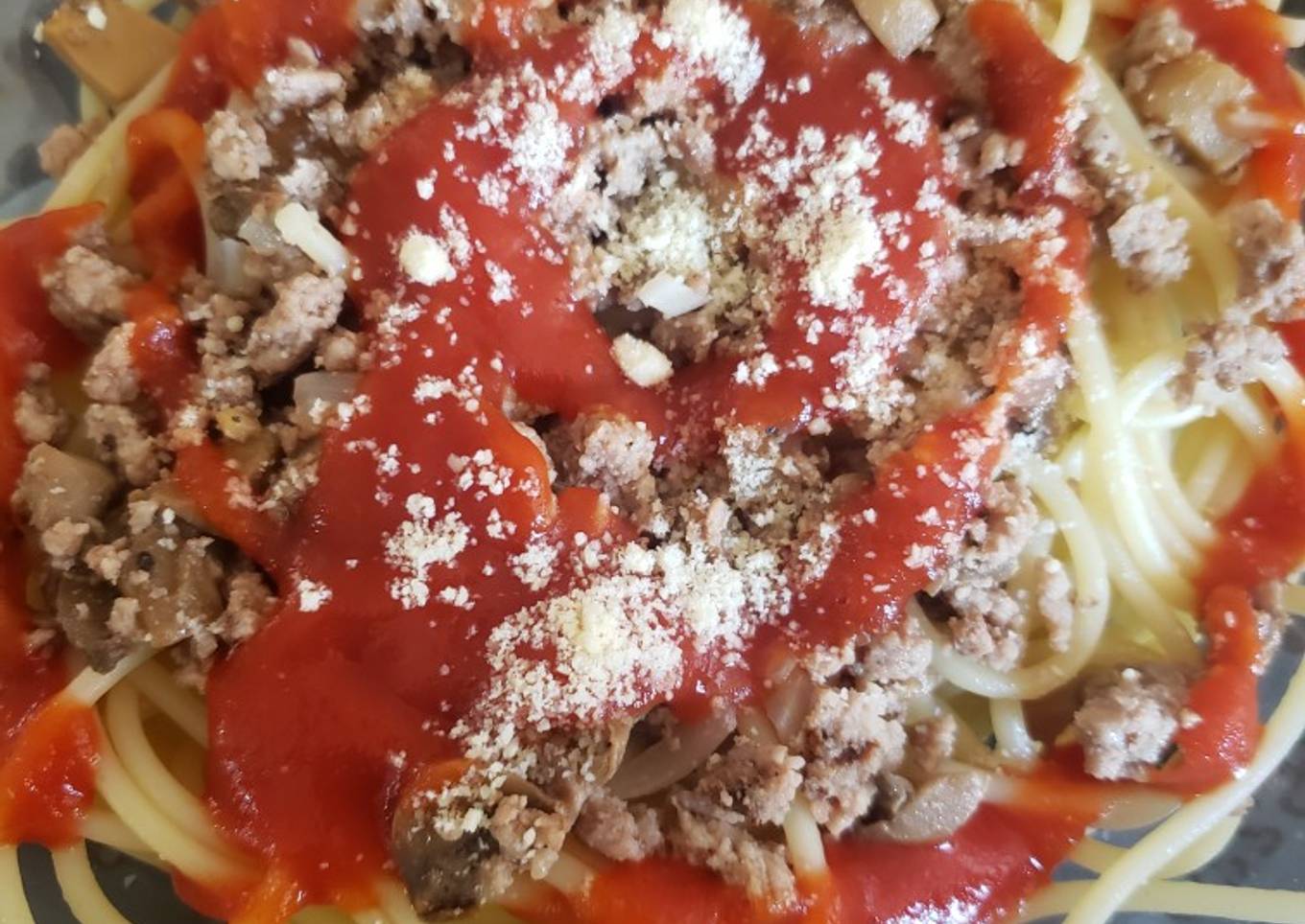 - Por último montamos en nuestro plato pasta, carne sazonada y el puré de tomate y adornamos con queso parmesano. Y a disfrutar! Provecho.