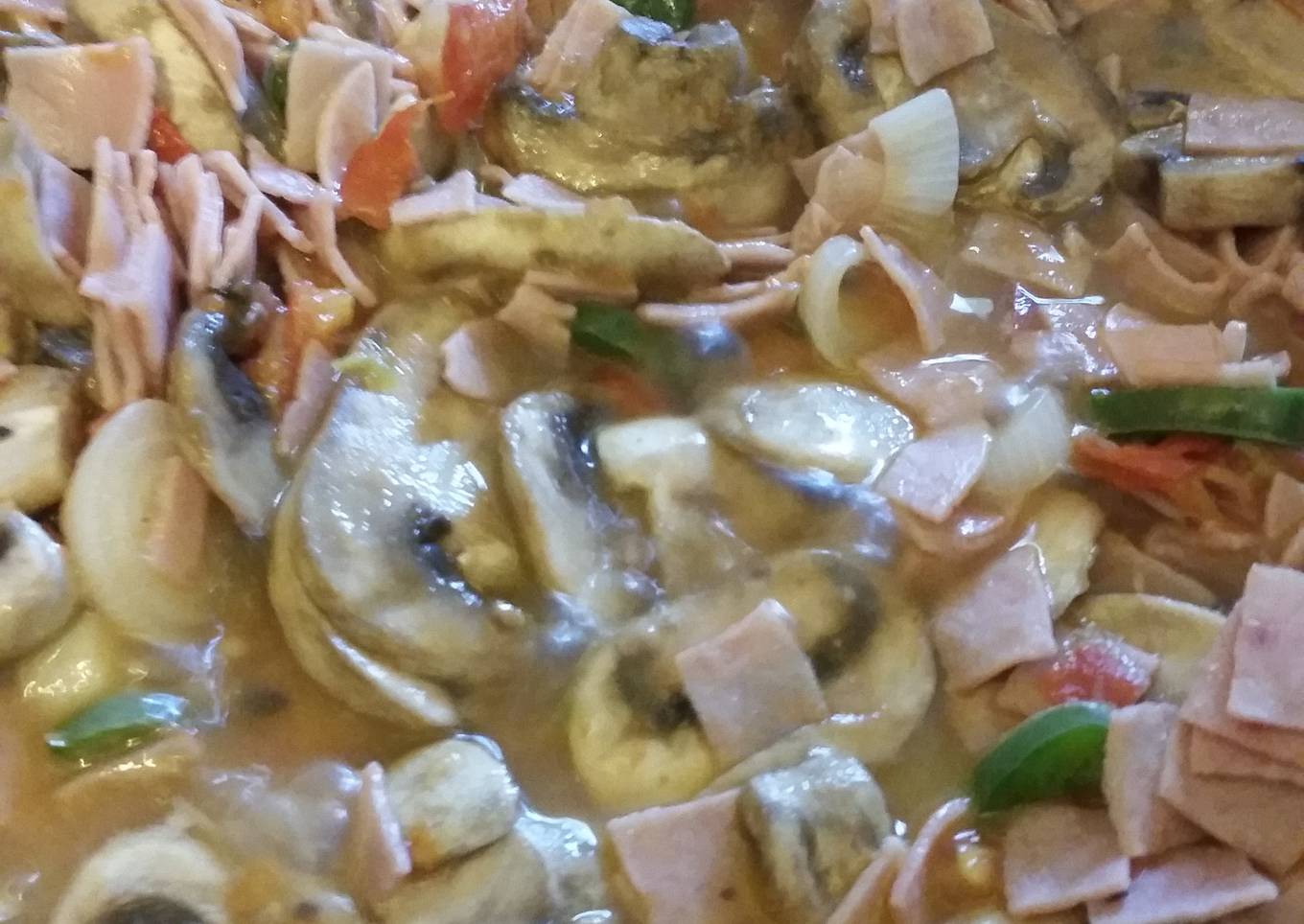 Guiso de champiñones con jamón, con un toque picante de chiles jalapeños.