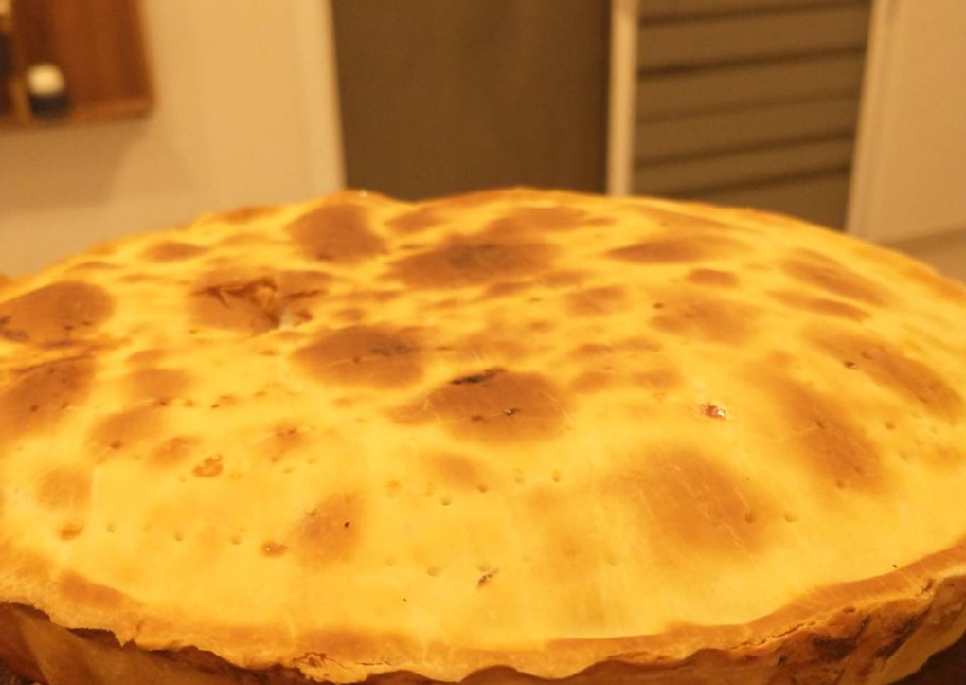 - Enharinar un molde para tarta, colocar la masa y luego el relleno, una vez que esté lista ponemos masa arriba y cubrimos.