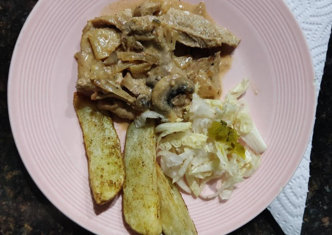 Cerdo,manzana,cebolla y champiñones con papas rústicas y lechuga