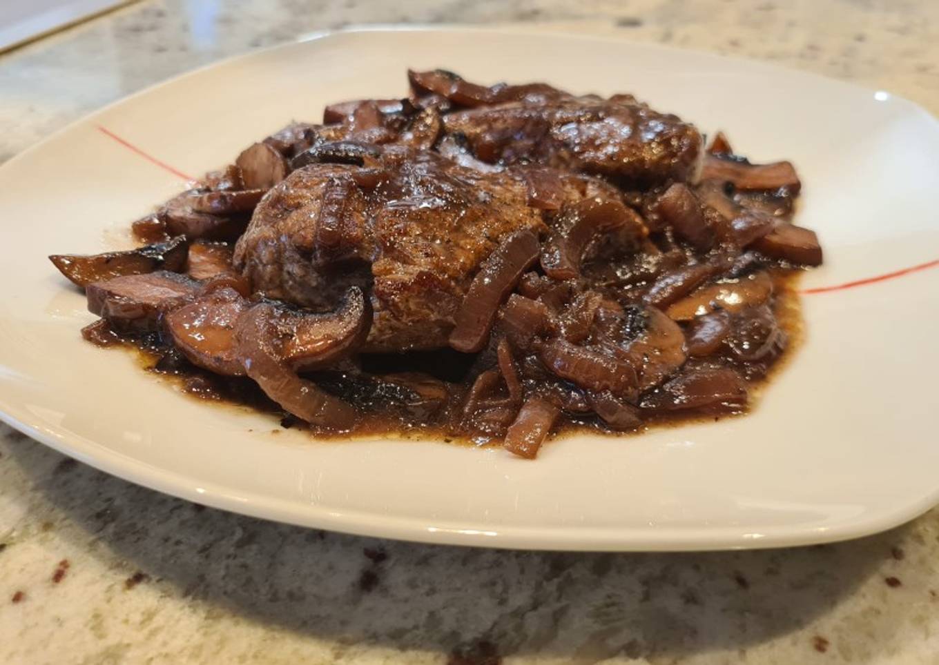 Medallones de ternera en salsa de vino tinto y champiñones