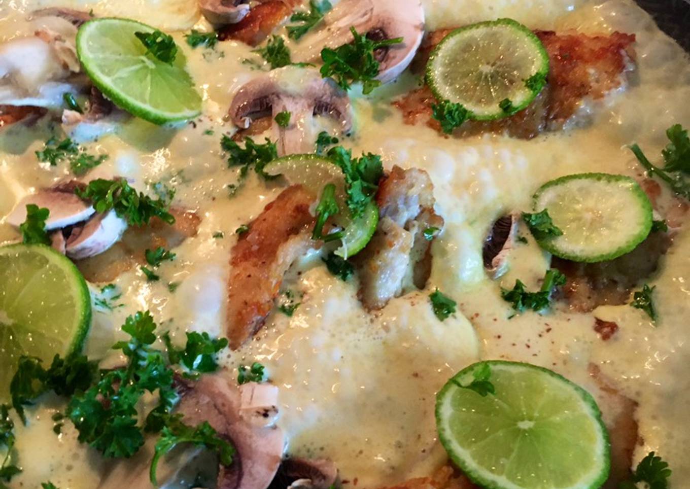 - Agregar la crema de leche y luego poner las pechugas y ya casi al apear poner el perejil y ruedas de limón y decorar