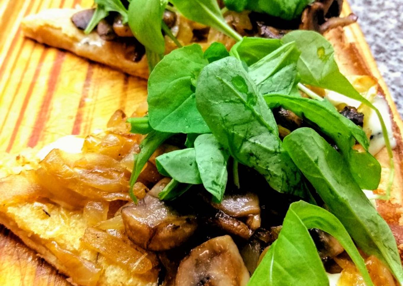 Fainá con cebolla caramelizada, champiñones y queso azul
