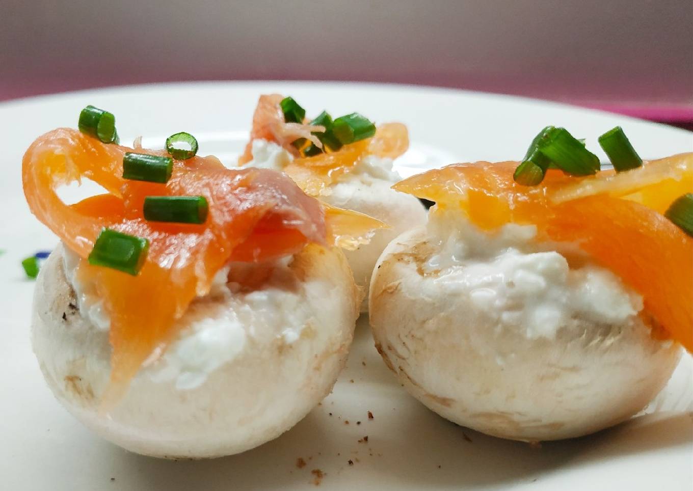- También puedes cortar el ahumado y el cebollino, mezclarlo con el quedó en crema que elijáis y rellenar los champiñones crudos...