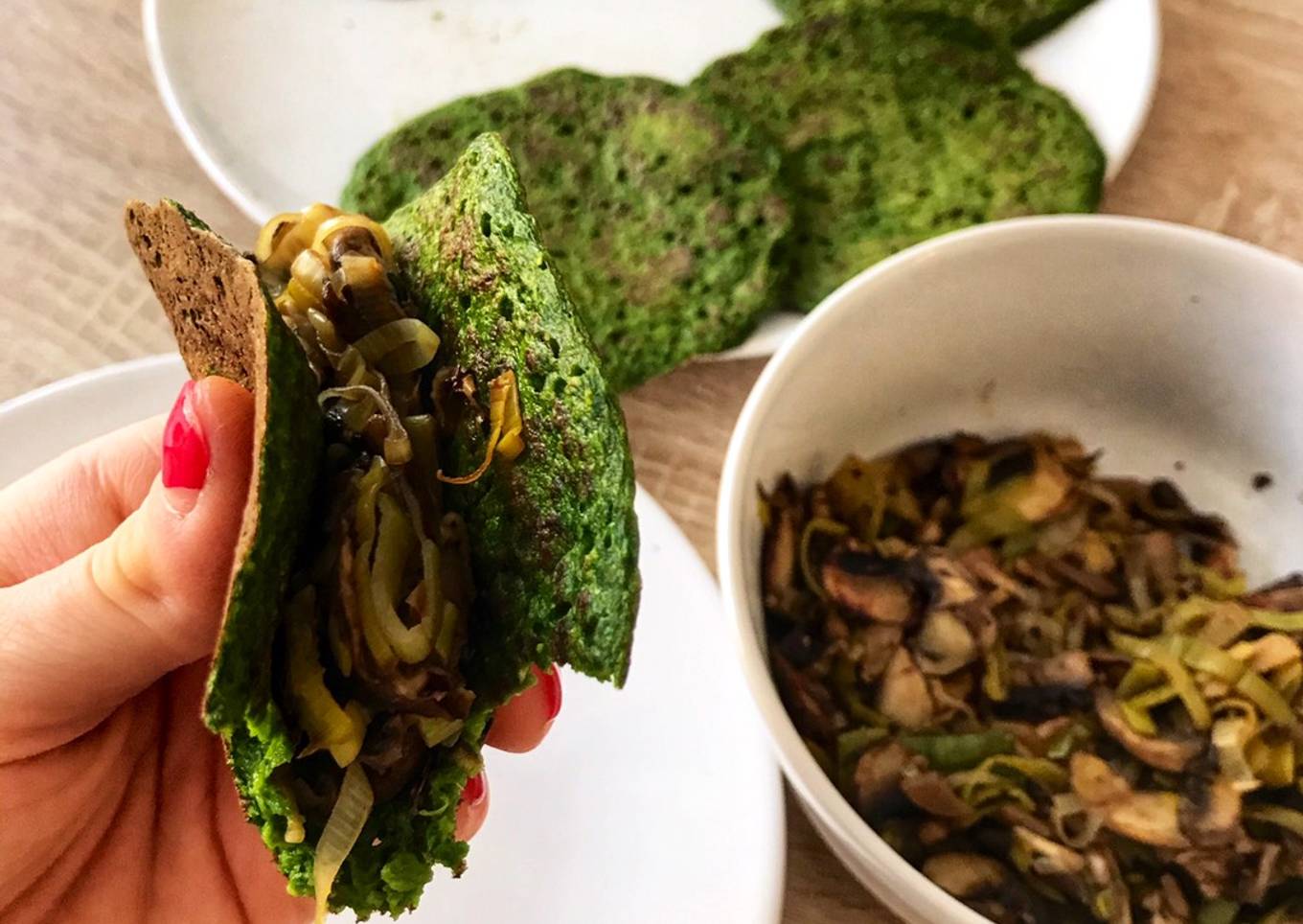 Tacos de espinacas con puerro y champiñones