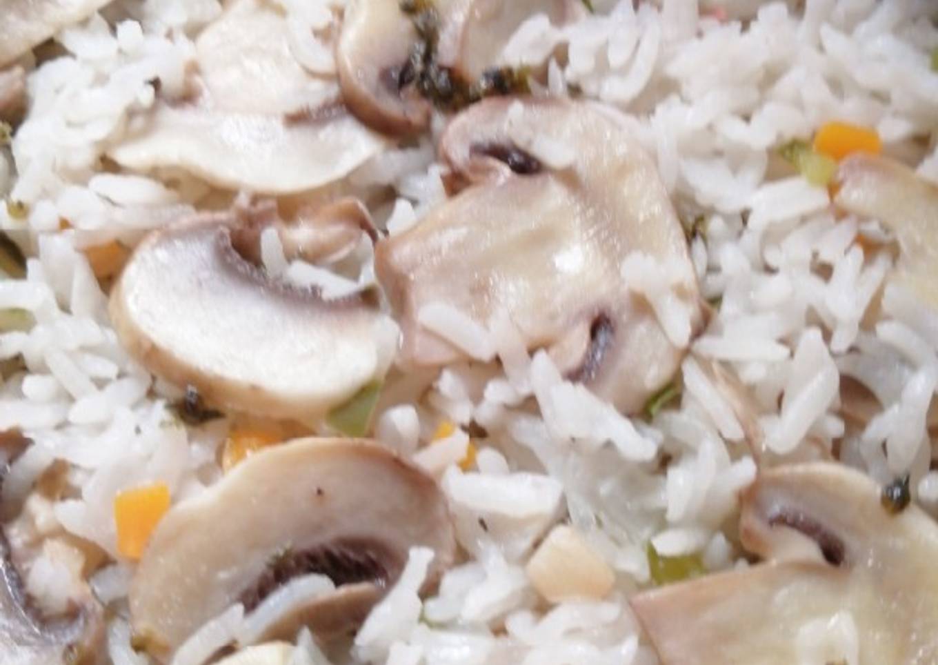 - Sofreír todas las verduras con un poco de aceite, añadir la taza de arroz y agregar dos tazas con agua. Añadir champiñones, pizca de sal y orégano
